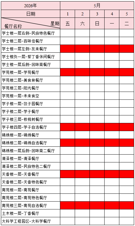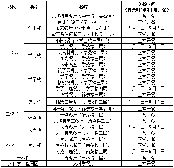 根据学校2026年五一期间安排,现将各餐厅开、关餐时间通知如下: