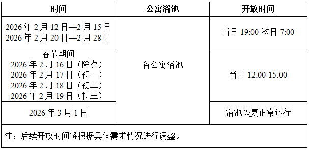 寒假期间各学生公寓浴池洗浴人数减少,为保障在校学生洗浴需求的基础上节约能耗,自2026年2月12日起,对各浴池开放时间作出如下调整: