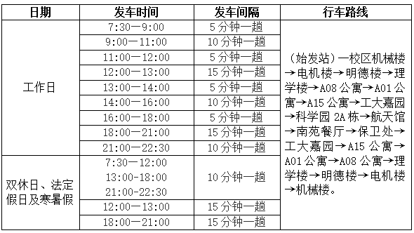 登陆哈尔滨工业大学官网“服务指南→生活服务→校园通勤车”或“服务指南→生活服务→后勤服务→服务指南→校园班车”、关注“哈尔滨工业大学微后勤”微信公众号点击“服务指南→校园班车”,即可查询线路、运行时刻表等相关信息。